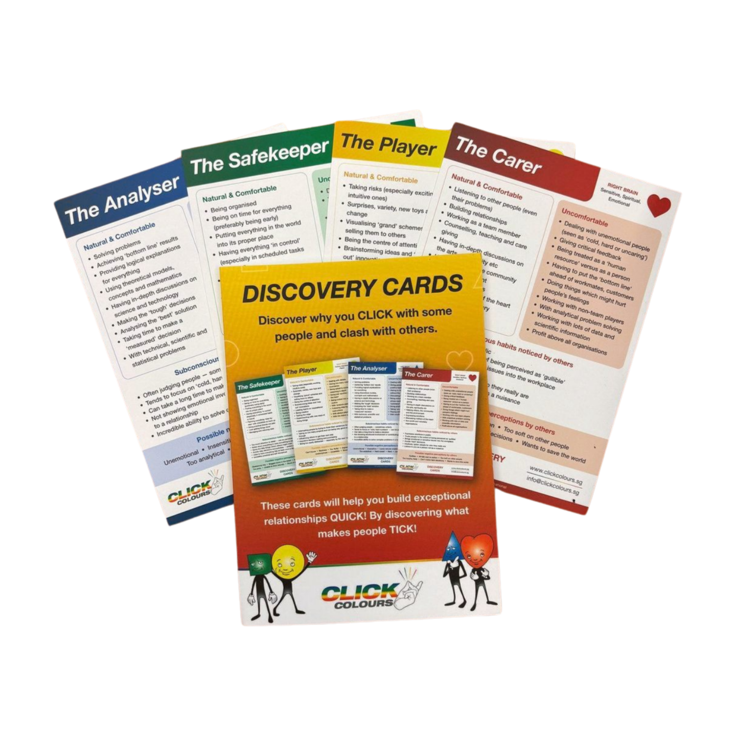 The Click! Colours Discovery Cards represent the next generation of personality tools and offer a better, faster, cheaper and easier way to help people and teams understand and value diversity in their organisations.