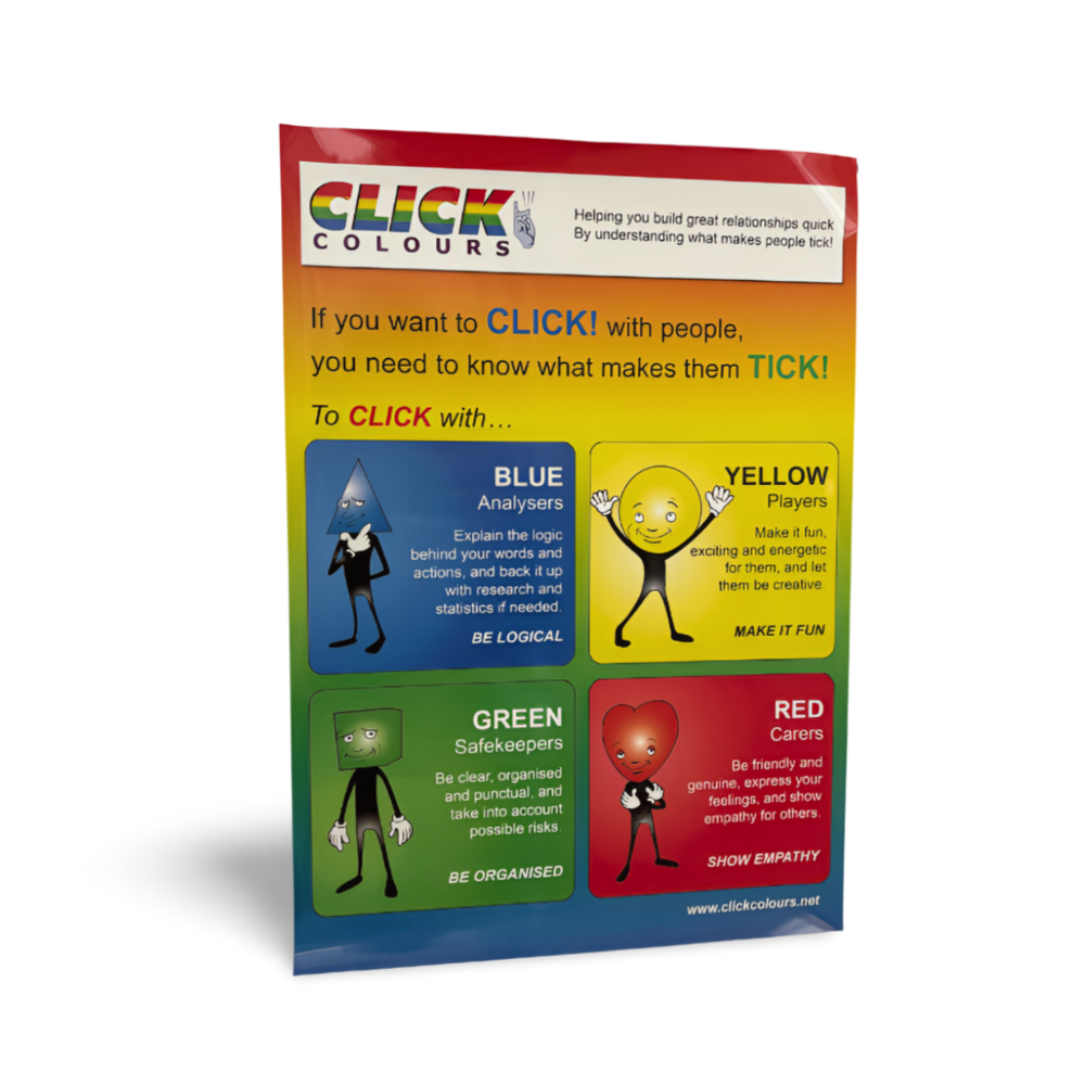 The Click! Colours help people and teams build relationships quick, by understanding what makes people tick!